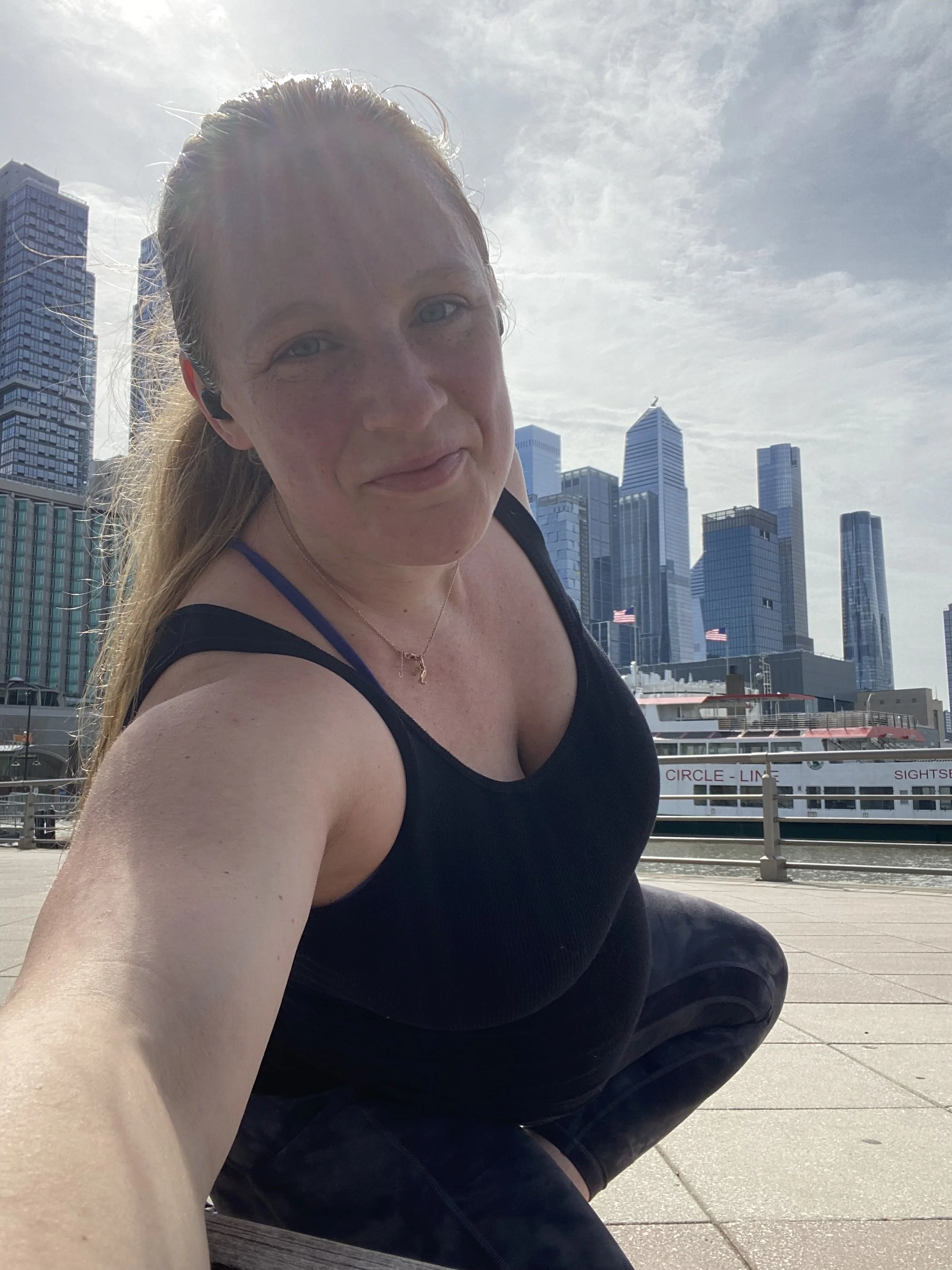 Shannon 8 months pregnant, finishing a workout by the water in NYC.